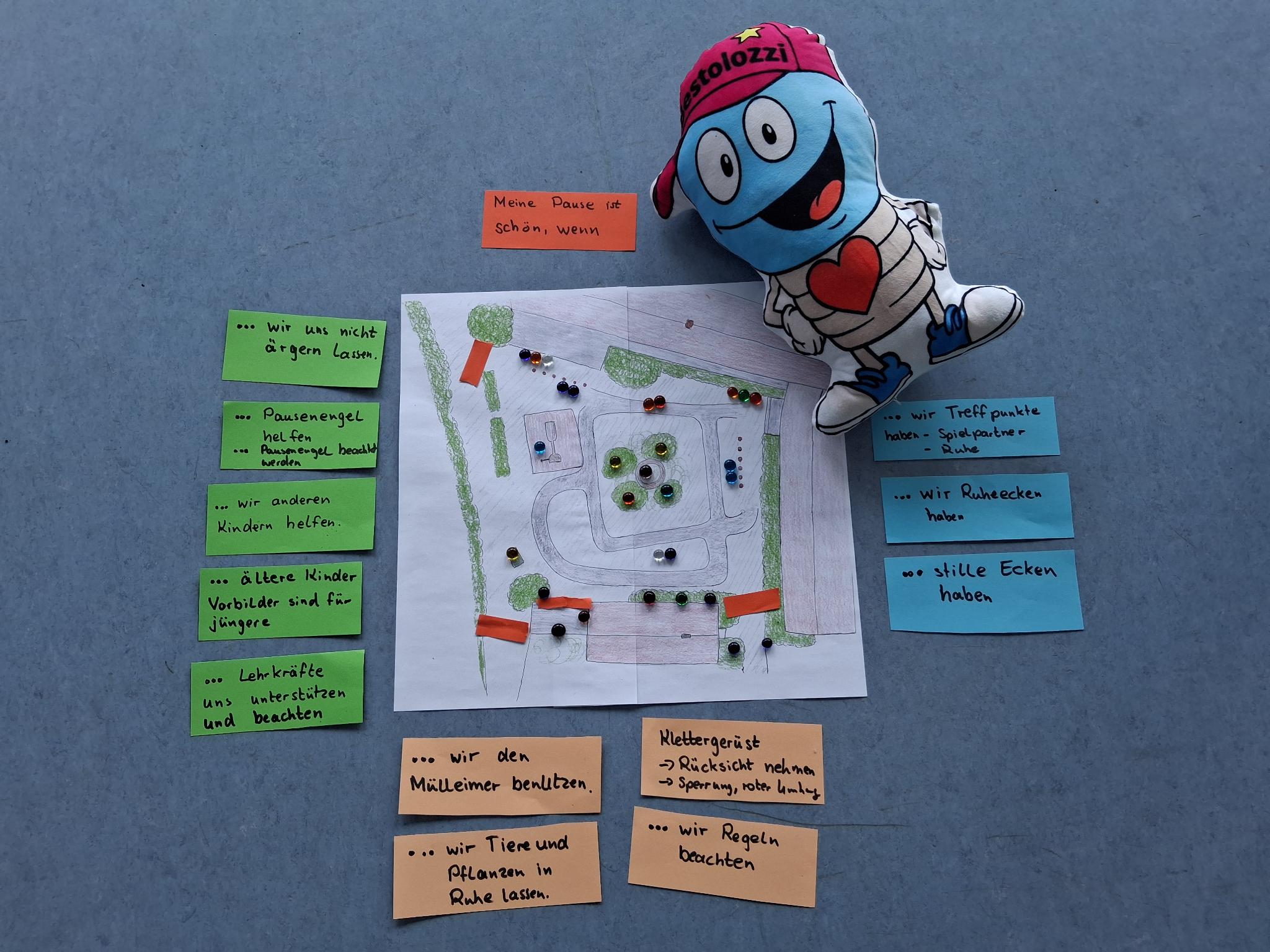 Mehrmals tagt an unserer Schule das Pestalozzi-Parlament. Es besteht aus jeweils zwei Vertretern der einzelnen Klassen und zwei Lehrkräften. Aktuelle Themen werden von allen Klassen besprochen und die Klassenvertreter bringen die Ergebnisse der Klassendiskussionen in das Parlament ein. Aktuell beschäftigt sich das Pestalozzi-Parlament mit dem Thema Pause: „Meine Pause ist schön, wenn …“ Aus vielen Klassen meldeten die Kinder, dass sich die einzelnen Klassen Ruhezonen in der Pause wünschten. Sie lokalisierten Räume in der Pause, die besonderer Aufmerksamkeit bedürfen, damit alle Kinder sich wohlfühlen. Eine gute Arbeitsgrundlage, um die Pause für alle Kinder als Wohlfühlzeit zu gestalten.